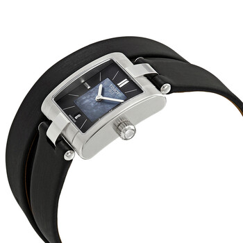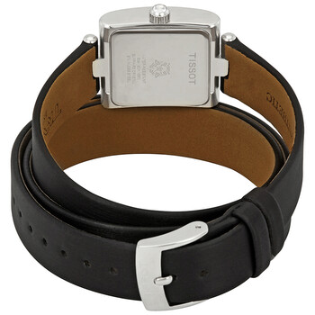Silver-tone stainless steel case with a black fabric strap. Fixed stainless steel bezel. Black mother of pearl dial with silver-tone hands and index hour markers. Dial Type: Analog. Date display at the 6 o'clock position. ETA Caliber F03.111 quartz movement. Scratch resistant sapphire crystal. Pull / push crown. Solid case back. Rectangle case shape, case size: 23 mm. case thickness: 7.3 mm. Tang clasp. Water resistant at 50 meters / 165 feet. Functions: date, hour, minute, battery eol indicator. Casual watch style. Watch label: Swiss Made. Tissot T-Collection Black Mother of Pearl Dial Ladies Watch T090.310.17.051.00.