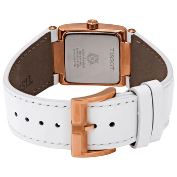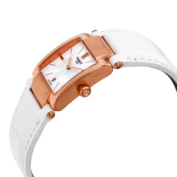 Rose gold PVD stainless steel case with a white leather strap. Fixed rose gold PVD bezel. Mother of pearl dial with rose gold-tone hands and index hour markers. Dial Type: Analog. Date display at the 6 o'clock position. ETA caliber F03.111 quartz movement. Scratch resistant sapphire crystal. Pull / push crown. Solid case back. Rectangle case shape. Case dimensions: 23 mm x 31.6 mm. Case thickness: 7.3 mm. Tang clasp. Water resistant at 50 meters / 165 feet. Functions: date, hour, minute, battery eol indicator. Casual watch style. Watch label: Swiss Made. Tissot T-Collection Mother of Pearl Dial Ladies Watch T090.310.36.111.00.
