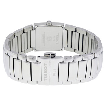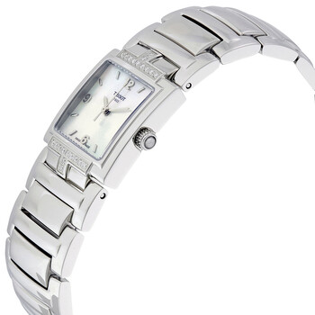Stainless steel case with a stainless steel bracelet. Fixed stainless steel bezel set with diamonds. Mother of pearl dial with silver-tone hands and index hour markers. Arabic numerasl mark the 3, 6, 9 and 12 o'clock positions. Dial Type: Analog. ETA caliber F03.111 quartz movement. Scratch resistant sapphire crystal. Pull / push crown. Solid case back. Square case shape. Case size: 23 mm. Case thickness: 7 mm. Band width: 23 mm. Deployment clasp. Water resistant at 30 meters / 100 feet. Functions: hour, minute, second. T-evocation series. Casual watch style. Watch label: Swiss Made. Item Variations: T051 310 61 117 00, T051-310-61-117-00, T051/310/61/117/00, T0513106111700. Tissot T-Evocation Mother of Pearl Dial Diamond Ladies Watch T0513106111700.