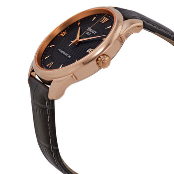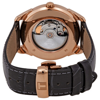 18kt rose gold case with a leather strap. Fixed rose gold-tone bezel. Black dial with rose gold-tone hands and Roman numeral hour markers. Minute markers around the outer rim. Dial Type: Analog. Date display at the 3 o'clock position. Tissot Calibre Powermatic 80 (C07.111) automatic movement with an 80-hour power reserve. Scratch resistant sapphire crystal. Transparent case back. Round case shape, case size: 40 mm, case thickness: 9.3 mm. Band width: 20 mm. Buckle clasp. Water resistant at 30 meters / 100 feet. Functions: date, hour, minute, second. Luxury watch style. Watch label: Swiss Made. Tissot T-Gold Automatic Men's Watch T920.407.76.068.00.