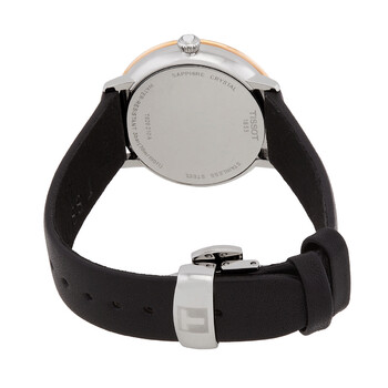 Silver-tone 316L stainless steel case with a black leather strap. Fixed 18kt rose gold bezel. Black dial with rose gold-tone hands and index hour markers. Minute markers around the outer rim. Dial Type: Analog. Date display at the 6 o'clock position. ETA F05.115 quartz movement. Scratch resistant sapphire crystal. Solid case back. Round case shape, case size: 33 mm, case thickness: 7.6 mm. Band width: 16 mm. Butterfly with push-buttons clasp. Water resistant at 30 meters / 100 feet. Functions: date, hour, minute, second,eol (battery end-of-life indicator). T-gold Series. Dress watch style. Watch label: Swiss Made. Tissot T-Gold Quartz Black Dial Ladies Watch T929.210.46.051.00.