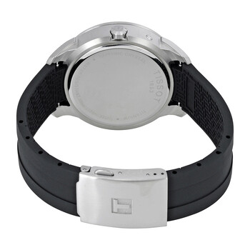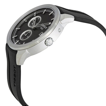 Titanium case with a black rubber strap. Fixed titanium bezel. Black dial with skeleton hands and index hour markers. Minute markers around the outer rim. Dial Type: Analog. Luminescent hands and markers. Date display at the 3 o'clock position. Two sub-dials displaying: seconds and 24 hours (GMT). Quartz movement. Scratch resistant sapphire crystal. Solid case back. Case diameter: 43 mm. Case thickness: 10.92 mm. Round case shape. Water resistant at 100 meters / 330 feet. Functions: date, hour, minute, second, GMT. Casual watch style. Tissot Titanium GMT White Dial Men's Watch T0694394403100.