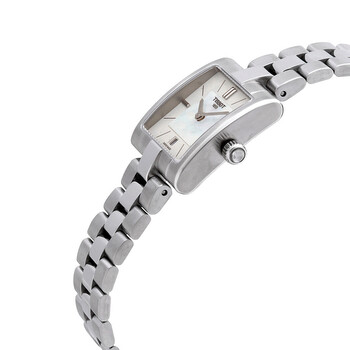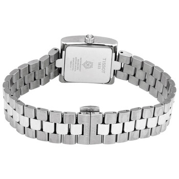 Stainless steel case with a stainless steel bracelet. Fixed stainless steel bezel. White mother of pearl dial with silver-tone hands and index hour markers. Dial Type: Analog. Date display at the 6 o'clock position. ETA caliber F03.111 quartz movement. Scratch resistant sapphire crystal. Pull / push crown. Solid case back. Square case shape. Case size: 23 mm. Case thickness: 7 mm. Deployment clasp. Water resistant at 50 meters / 165 feet. Functions: date, hour, minute. Casual watch style. Watch label: Swiss Made. Tissot T-Lady Mother of Pearl Dial Ladies Watch T090.310.11.111.01.