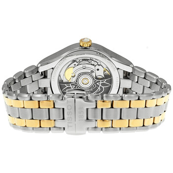 Stainless steel case with a two-tone (silver and rose gold PVD) stainless steel bracelet. Fixed rose gold PVD bezel. Mother of pearl / white dial with rose gold-tone hands and index hour markers. Roman numerals mark the 4, 8 and 12 o'clock positions. Dial Type: Analog. Date display at the 3 o'clock position. Automatic movement with an 80-hour power reserve. Scratch resistant sapphire crystal. Push / pull crown. Skeleton case back. Case diameter: 34 mm. Case thickness: 9.3 mm. Round case shape. Bracelet width: 11.75 mm. Butterfly clasp with a push button release. Water resistant at 50 meters / 165 feet. Functions: date, hour, minute, second. Casual watch style. Watch label: Swiss Made. Tissot T-Lady Powermatic 80 Mother of Pearl Dial Two-tone Ladies Watch T0722072211801.