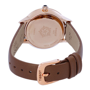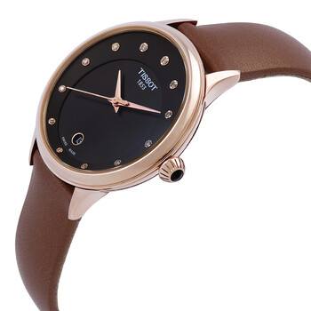 Rose gold-tone stainless steel case with a brown leather strap. Fixed rose gold-tone bezel. Black dial with rose gold-tone hands and diamond hour markers. Dial Type: Analog. Date display at the 6 o'clock position. ETA F05.115 quartz movement. Scratch resistant sapphire crystal. Solid case back. Round case shape, case size: 33 mm, case thickness: 8.1 mm. Buckle clasp. Water resistant at 50 meters / 165 feet. Functions: date, hour, minute, second. T-lady Series. Dress watch style. Watch label: Swiss Made. Tissot T-Lady Quartz Diamond Black Dial Ladies Watch T133.210.36.056.00.