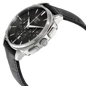 Silver-tone stainless steel case with a black calfskin leather strap. Fixed silver-tone stainless steel bezel. Black dial with silver-tone hands and index hour markers. Minute markers around the outer rim. Dial Type: Analog. Date display at the 6 o'clock position. Chronograph - three sub-dials displaying: 60 second, 30 minute and 12 hour. ETA-Valjoux Caliber 7753 Automatic movement, based upon ETA 7750, containing 27 Jewels, bitting at 28800 vph, and has a power reserve of approximately 44 hours. Scratch resistant sapphire crystal. Screw down crown. Transparent case back. Cushion case shape, case size: 40 mm, case thickness: 14 mm. Band width: 22 mm, band length: 8 inches. Deployment with push button release clasp. Water resistant at 50 meters / 165 feet. Functions: chronograph, date, hour, minute, second. Casual watch style. Watch label: Swiss Made. Item Variations: T059 527 16 051 00, T059-527-16-051-00, T059/527/16/051/00, T0595271605100. Tissot T-Lord Automatic Chronograph Black Dial Men's Watch T0595271605100.