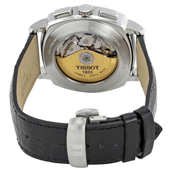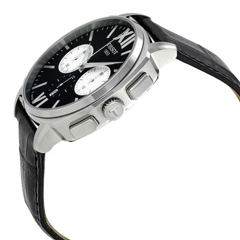 Silver-tone stainless steel case with a black leather strap. Fixed silver-tone stainless steel bezel. Black dial with silver-tone hands and index hour markers. Roman numerals mark the 6 and 12 o'clock positions. minute markers around the outer rim. Dial Type: Analog. Date display at the 6 o'clock position. Chronograph - three sub-dials displaying: 60 second, 30 minute and 12 hour. ETA-Valjoux Caliber 7753 Automatic movement, based upon ETA 7750, containing 27 Jewels, bitting at 28800 vph, and has a power reserve of approximately 44 hours. Scratch resistant sapphire crystal. Pull / push crown. Transparent case back. Cushion case shape, case size: 42.2 mm, case thickness: 13.6 mm. Band width: 21 mm, band length: 8 inches. Deployment with push button release clasp. Water resistant at 50 meters / 165 feet. Functions: chronograph, date, hour, minute, second. Casual watch style. Watch label: Swiss Made. Item Variations: T059 527 16 058 00, T059-527-16-058-00, T059/527/16/058/00, T0595271605800. Tissot T-Lord Automatic Chronograph Black Dial Men's Watch T0595271605800.