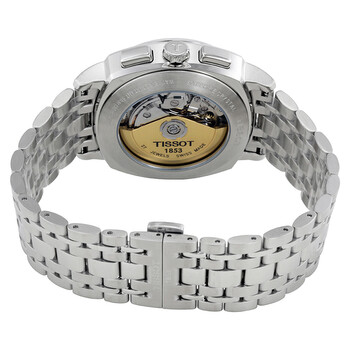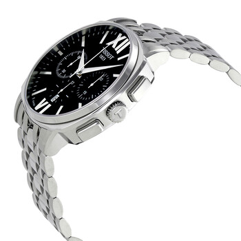Stainless steel case with a stainless steel bracelet. Fixed stainless steel bezel. Black dial with silver-tone hands and index hour markers. Roman numerals mark the 6 and 12 o'clock positions. Minute markers around the outer rim. Dial Type: Analog. Date display at the 6 o'clock position. Chronograph - three sub-dials displaying: 60 second, 30 minute and 12 hour. Automatic movement. Scratch resistant mineral crystal. Pull / push crown. Transparent case back. Case diameter: 42.2 mm. Case thickness: 13.6 mm. Cushion case shape. Band width: 21 mm. Band length: 8 inches. Fold over clasp with a safety release. Water resistant at 50 meters / 165 feet. Functions: chronograph, date, hour, minute, second. Casual watch style. Watch label: Swiss Made. Tissot T-Lord Chronograph Black Dial Men's Watch T0595271105800.