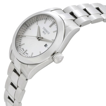 Silver-tone stainless steel case and bracelet. Fixed silver-tone stainless steel bezel. Silver dial with silver-tone hands and index hour markers. Minute markers around the outer rim. Dial Type: Analog. Date display at the 3 o'clock position. ETA Caliber F03.111 quartz movement. Scratch resistant sapphire crystal. Pull / push crown. Solid case back. Round case shape, case size: 29.3 mm, case thickness: 9.7 mm. Band width: 15 mm. Deployment with push button release clasp. Water resistant at 100 meters / 330 feet. Functions: date, hour, minute, second, battery eol indicator. T-my Lady Series. Casual watch style. Watch label: Swiss Made. Tissot T-My Lady Quartz Silver Dial Ladies Watch T132.010.11.031.00.