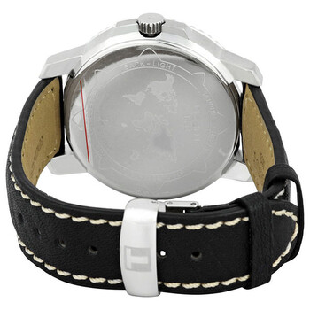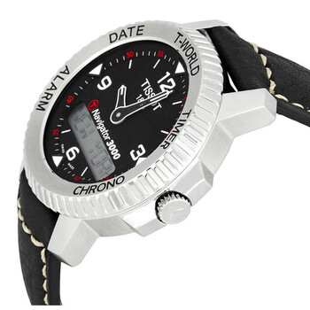 Stainless steel case with a black leather bracelet. Rotating bezel. Black dial with luminous hands and Arabic and stick hour markers. Minute markers around the outer rim. Perpetual calendar. Quartz movement. Scratch resistant synthetic sapphire crystal. Case diameter: 42.5 mm. Case thickness: 12 mm. Push button deployment clasp. Water resistant at 50 meters / 165 feet. Functions: hours, minutes, seconds, date, alarm, chronograph. Tissot T-Navigator 3000 Men's Watch T96.1.428.52.