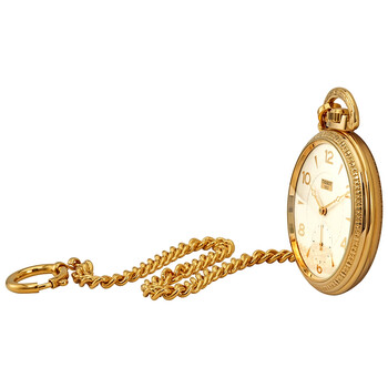 Gold-tone brass case. Silver-tone dial with gold-tone hands and Arabic numeral and index hour markers. Dial Type: Analog. One - small second subdial. ETA Caliber Unitas 6497 hand wind movement with a 46-hour power reserve. Scratch resistant mineral crystal. Round case shape, case size: 51.8 mm, case thickness: 14.7 mm. Functions: hour, minute, small second. Casual watch style. Watch label: Swiss Made. Tissot T-Pocket Lepine Mechanical Pocket Watch T82.4.407.34.