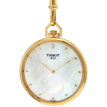 Yellow gold PVD stainless steel case with a gold-tone chain. Fixed yellow gold PVD bezel. Mother of pearl dial with gold-tone hands and diamond hour markers. Dial Type: Analog. Scratch resistant mineral crystal. Quartz movement. Solid case back. Round case shape. Case size: 41.5 mm. Case thickness: 6.66 mm. Water resistant at 30 meters / 100 feet. Functions: hour, minute. Casual watch style. Watch label: Swiss Made. Tissot T-Pocket Lepine Quartz Mother of Pearl Diamond Dial Unisex Pocket Watch T82.4.502.76.
