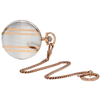 Gold-tone golden and palladium brass case with a rose gold 5N stainless steel chain. Fixed gold-tone golden and palladium brass bezel. White dial with black leaf-style hands and Roman numeral hour markers. Minute markers. Arabic numeral minute markers (at 5 minute intervals) around the outer rim. Dial Type: Analog. Date display at the 6 o'clock position. ETA caliber F06.111 quartz movement. Scratch resistant hesalite mineral crystal. Solid case back. Round case shape. Case size: 48.5 mm. Case thickness: 10.2 mm. Functions: date, hour, minute, second. T-pocket Series. Casual watch style. Watch label: Swiss Made. Tissot T-Pocket White Dial Men's Pocket Watch T862.410.29.013.00.