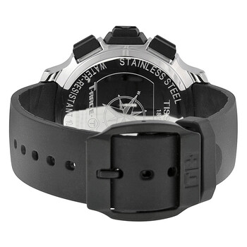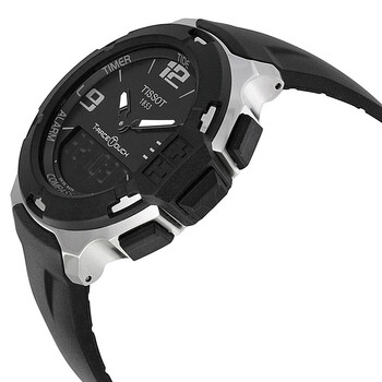 Stainless steel case with a black rubber strap. Fixed stainles steel bezel with a black top ring. Black dial with luminous hands and index hour markers. Arabic numerals mark the 3, 9 and 12 o'clock positions. Dial Type: Analog-Digital. Black digital sub-dial displaying dual time. Quartz movement. Scratch resistant sapphire crystal. Solid case back. Case diameter: 43 mm. Round case shape. Band width: 20 mm. Tang clasp. Water resistant at 100 meters / 330 feet. Additional Info: tidw, split time, compass, timer, alarm, lap time. Casual watch style. Tissot T-Race Analog Digital Black Rubber Men's Watch T0814201705701
