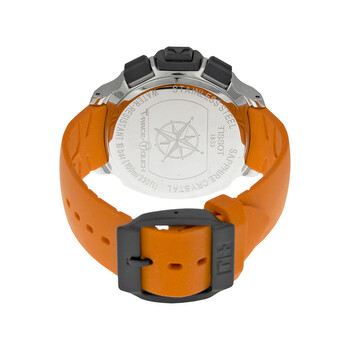 Stainless steel case with a orange rubber strap. Fixed black and silver-tone bezel. Black dial with luminous hands and index hour markers. Arabic numerals mark the 3, 9 and 12 o'clock positions. Dial Type: Analog-digital. Perpetual calendar. Black digital. ETA Caliber E49.301 quartz movement. Scratch resistant sapphire crystal. Solid case back. Case size: 43 mm. Round case shape. Band width: 20 mm. Tang clasp. Water resistant at 100 meters / 330 feet. Functions: perpetual calendar, chronograph, world time, alarm, month, date, day, GMT, second time zone, hour, minute, second, thermometer, altitude indicator, barometer, compass, tide indicator. Additional Info: touch screen, stop watch, split time. Casual watch style. Watch label: Swiss Made. Tissot T-Race Analog Digital Orange Rubber Men's Watch T0814201705702.