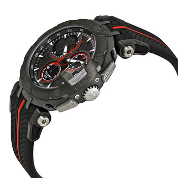 Grey and black PVD stainless steel case with a black and red silicone strap. Anthracite bezel. Anthracite dial with silver-tone hands and index hour markers. Tachymeter. Dial Type: Analog. Luminescent hands and markers. Date display at the 3 o'clock position. Chronograph - three sub-dials displaying: 60 second, 30 minute and 1/10th of a second. Quartz movement. Scratch resistant sapphire crystal. Solid case back. Case size: 45.25 mm. Case thickness: 20 mm. Round case shape. Band width: 12.8 mm. Water resistant at 100 meters / 330 feet. Functions: chronograph, date, hour, minute, second. Sport watch style. Watch label: Swiss Made. It comes in the original Tissot box. Helmet is not provided.Tissot T-Race Anthracite Dial Men's Rubber Chronograph Watch T092.417.37.067.00.