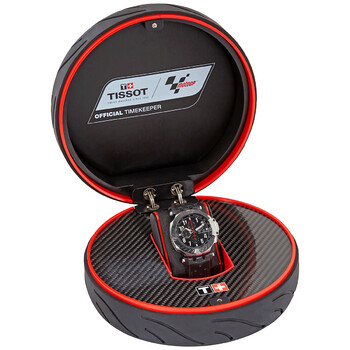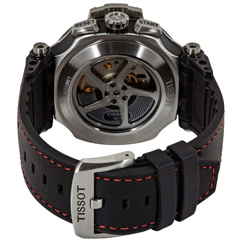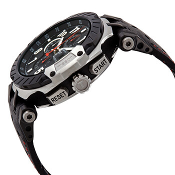 Black PVD stainless steel case with a black rubber strap. Fixed black PVD bezel. Black dial with luminous silver-tone hands and Arabic numeral hour markers. Minute markers. Tachymeter markings around the outer rim. Dial Type: Analog. Luminescent hands and markers. Date display at the 3 o'clock position. Chronograph - three sub-dials displaying: 60 second, 30 minute and 6 hour. ETA caliber C01.211 automatic movement, based upon Lemania 5100, containing 15 Jewels, bitting at 28800 vph, and has a power reserve of approximately 45 hours. Scratch resistant sapphire crystal. Transparent case back. Round case shape. Case size: 48.8 mm. Case thickness: 16.6 mm. Band width: 22 mm. Tang clasp. Water resistant at 100 meters / 330 feet. Functions: chronograph, tachymeter, date, hour, minute, second. T-race Series. Sport watch style. Watch label: Swiss Made. Tissot T-Race Chronograph Automatic Black Dial Men's Watch T115.427.27.057.00.