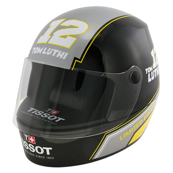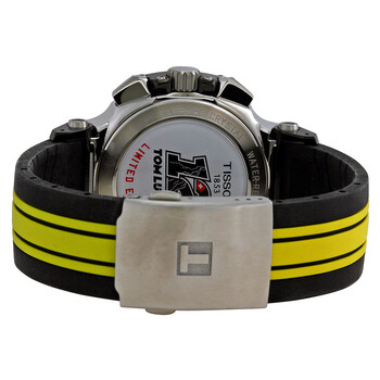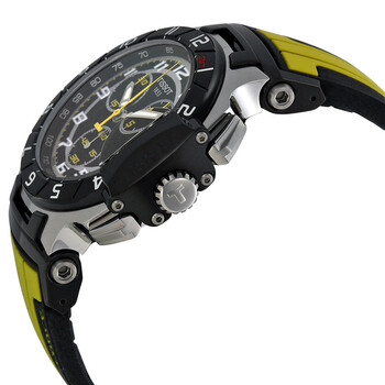 Stainless steel case with a black and yellow silicone rubber strap. Black PVD bezel. Black dial with luminous hands and Arabic numeral hour markers. Minute markers around the outer rim. Dial Type: Analog. Luminescent hands and markers. Date display at the 3 o'clock position. Chronograph - three sub-dials displaying: 60 second, 30 minute and 1/10th of a second. Quartz movement. Scratch resistant sapphire crystal. Solid case back. Case diameter: 45.3 mm. Case thickness: 13 mm. Round case shape. Band width: 21 mm. Fold over clasp. Water resistant at 100 meters / 330 feet. Functions: chronograph, date, hour, minute, second. Sport watch style. Tissot T-Race Chronograph Black Dial Black and Yellow Rubber Men's Watch T0484172705713.