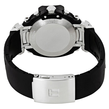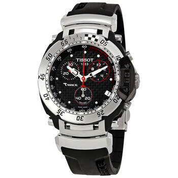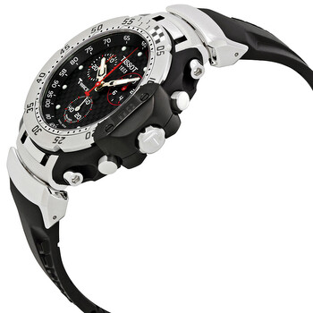 Stainless steel case with a black rubber strap. Uni-directional rotating stainless steel bezel. Black dial with luminous silver-tone hands and index hour markers. Tachymeter markers around the outer rim. Dial Type: Analog. Luminescent hands and markers. Date display at the 4 o'clock position. Chronograph - three sub-dials displaying: 60 second, 30 minute and 1/10th of a second. Quartz movement. Scratch resistant sapphire crystal. Solid case back. Case size: 45.3 mm. Case thickness: 12 mm. Round case shape. Fold over clasp with a safety release. Water resistant at 100 meters / 330 feet. Functions: chronograph, tachymeter, date, hour, minute, second. Sport watch style. Watch label: Swiss Made. Tissot T-Race Chronograph Black Dial Men's Watch T027.417.17.201.06.