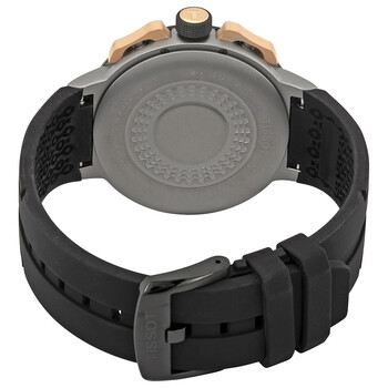 Black and rose gold PVD stainless steel case with a black silicone strap. Fixed black aluminium bezel showing tachymeter markings. Black dial with luminous rose gold-tone hands and index hour markers. Minute markers around the outer rim. Dial Type: Analog. Luminescent hands and markers. Date display at the 4 o'clock position. Chronograph - three sub-dials displaying: 60 second, 30 minute and 1/10th of a second. ETA Caliber G10.212 quartz movement. Scratch resistant sapphire crystal. Pull / push crown. Solid case back. Round case shape. Case size: 44.5 mm. Case thickness: 11.4 mm. Band width: 18 mm. Tang clasp. Water resistant at 100 meters / 330 feet. Functions: chronograph, rattrapante, date, hour, minute, small second. Sport watch style. Watch label: Swiss Made. Tissot T-Race Chronograph Black Dial Men's Watch T111.417.37.441.07.