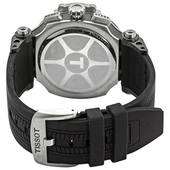 Black PVD stainless steel case with a black silicone strap. Fixed stainless steel bezel with a black PVD ring. White dial with luminous black hands and index hour markers. Minute markers. Tachymeter markings around the outer rim. Dial Type: Analog. Luminescent hands and markers. Date display at the 3 o'clock position. Chronograph - three sub-dials displaying: 60 second, 60 minute and 1/10th of a second. ETA caliber G10.212 quartz movement. Scratch resistant sapphire crystal. Solid case back. Round case shape. Case size: 47.6 mm. Case thickness: 12.25 mm. Band width: 22 mm. Tang clasp. Water resistant at 100 meters / 330 feet. Functions: chronograph, date, hour, minute, second. Sport watch style. Watch label: Swiss Made. Tissot T-Race Chronograph Quartz White Dial Men's Watch T115.417.27.011.00.