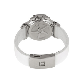 Stainless steel case with a white rubber strap. Fixed stainless steel bezel with a silver-tone top ring. White dial with luminous hands and index hour markers. Arabic numerals mark the 6, 9 and 12 o'clock positions. Minute markers. tachymeter around the outer rim. Dial Type: Analog. Luminescent hands and markers. Date display at the 3 o'clock position. Chronograph - three sub-dials displaying: 60 seconds, 30 minutes and 1/10th of a second. ETA Caliber G15.211 quartz movement. Scratch resistant sapphire crystal. Screw down crown. Solid case back. Case size: 36.65 mm. Case thickness: 12 mm. Round case shape. Band width: 22 mm. Deployment clasp. Water resistant at 100 meters / 330 feet. Functions: chronograph, date, hour, minute, second. Casual watch style. Watch label: Swiss Made. Item Variations: T048 217 17 017 00, T048-217-17-017-00, T048/217/17/017/00, T0482171701700. Tissot T-Race Chronograph White Dial Ladies Watch T0482171701700.