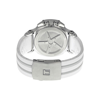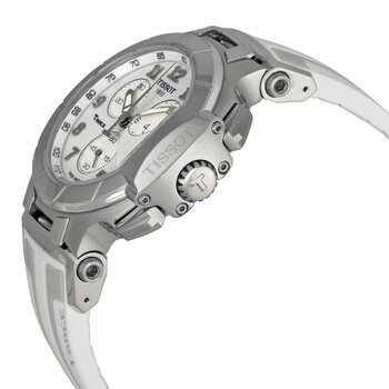 Stainless steel case with a white silicone strap. Fixed stainless steel bezel. White-grey dial with silver-tone hands and Arabic numeral hour markers. Tachymeter scale around the outer rim. Dial Type: Analog. Luminescent hands. Date display at the 3 o'clock position. Chronograph - three sub-dials displaying: 60 second, 30 minute and 1/10th of a second. Scratch resistant sapphire crystal. Quartz movement. Solid case back. Case diameter: 50.26 mm. Round case shape. Deployment clasp. Water resistant at 100 meters / 330 feet. Functions: chronograph, tachymeter, date, hour, minute, second. Sport watch style. Watch label: Swiss Made. Tissot T-Race Chronograph White Grey Dial White Silicone Men's Watch T0484171701200.