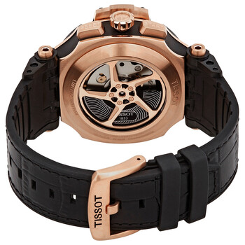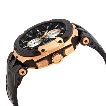 Rose gold PVD stainless steel case with a black (croco-embossed) leather strap. Fixed black PVD bezel. Black dial with luminous rose gold-tone hands and index hour markers. Tachymeter scale around the outer rim. Dial Type: Analog. Luminescent hands and markers. Date display at the 3 o'clock position. Chronograph - three sub-dials displaying: 60 second, 30 minute and 6 hours. ETA caliber G10.212 automatic movement with a 45-hour power reserve. Scratch resistant sapphire crystal. Transparent case back. Round case shape. Case size: 48.8 mm. Case thickness: 16.6 mm. Band width: 22 mm. Tang clasp. Water resistant at 100 meters / 330 feet. Functions: chronograph, date, hour, minute, second. Additional Info: limited edition to 3333 pieces. Sport watch style. Watch label: Swiss Made. Tissot T-Race Marc Marquez 2019 Automatic Men's Limited Edition Watch T115.427.37.051.00.