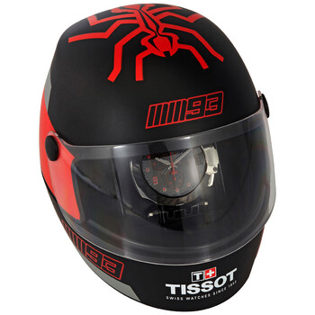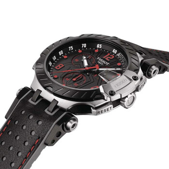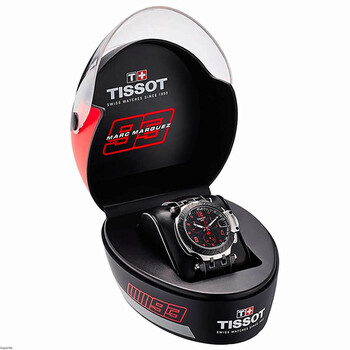 Stainless steel case with a black leather strap. Fixed black PVD bezel. Black dial with luminous silver-tone hands and index hour markers. Arabic numerals appear at the 4, 8 and 12 o'clock positions. Minute markers. Tachymeter markers around the outer rim. Dial Type: Analog. Luminescent hands and markers. Date display at the 3 o'clock position. Chronograph - three sub-dials displaying: 60 second, 30 minute and 1/10th of a second. ETA Caliber G10.212 quartz movement. Scratch resistant sapphire crystal. Solid case back. Round case shape. Case size: 43 mm. Case thickness: 12.7 mm. Band width: 22 mm. Tang clasp. Water resistant at 100 meters / 330 feet. Functions: chronograph, rattrapante, date, hour, minute, small second. Additional Info: engraved caseback. T-race Marc Marquez Limited Edition Series. Sport watch style. Watch label: Swiss Made. Tissot T-Race Marc Marquez Limited Edition Chronograph Quartz Black Dial Men's Watch T115.417.27.057.01.