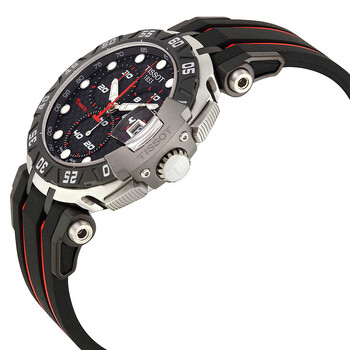 Stainless steel case with a red and black rubber strap. Fixed silver-tone bezel with a black PVD top ring. Black dial with luminescent hands and dot hour markers. Minute markers around the outer rim and tachymeter. Dial Type: Analog. Luminescent hands and markers. Date display at the 3 o'clock position. Chronograph - three sub-dials displaying: 60 second, 30 minute and 1/10th of a second. ETA caliber G10.211 quartz movement. Scratch resistant sapphire crystal. Screw down crown. Solid case back. Case size: 45.25 mm. Case thickness: 13 mm. Round case shape. Band width: 21 mm. Band length: 9 inches. Fold over clasp with a push button release. Water resistant at 100 meters / 330 feet. Functions: chronograph, date, hour, minute, second. Sport watch style. Watch label: Swiss Made. Tissot T-Race MotoGP 2015 Black Dial Men's Sports Watch T0924172720100.