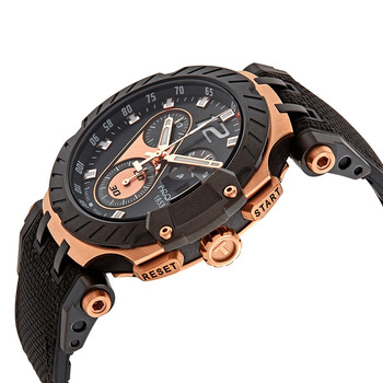 Rose gold PVD 316L stainless steel case (with black inlays) with a black rubber strap. Fixed black PVD bezel. Black dial with luminous rose gold-tone hands and index hour markers. An Arabic numeral appears at the 12 o'clock position. Minute markers around the outer rim. Dial Type: Analog. Luminescent hands and markers. Date display at the 3 o'clock position. Chronograph - three sub-dials displaying: 60 second, 30 minute and 1/10th of a second. ETA Caliber G10.212 quartz movement. Scratch resistant sapphire crystal. Solid case back. Round case shape. Case size: 47.6 mm. Case thickness: 12.7 mm. Band width: 22 mm. Tang clasp. Water resistant at 100 meters / 330 feet. Functions: chronograph, rattrapante, date, hour, minute, small second. Additional Info: limited edition 4999 pieces. Sport watch style. Watch label: Swiss Made. Tissot T-Race MOTOGP 2019 Men's Limited Edition Watch T115.417.37.057.00.