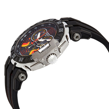 Stainless steel case with a two-tone (black and red) rubber strap. Uni-directional rotating stainless steel with a black top ring bezel. Black dial with luminous silver-tone hands and index hour markers. Arabic numerals mark the 4, 8 and 12 o'clock positions. Minute markers. tachymeter markings around the outer rim. Dial Type: Analog. Luminescent hands and markers. Date display at the 3 o'clock position. Chronograph - three sub-dials displaying: 60 second, 30 minute and 12 hour. ETA caliber G10.212 quartz movement. Scratch resistant sapphire crystal. Pull / push crown. Solid case back. Round case shape. Case size: 45 mm. Case thickness: 12.8 mm. Band width: 20 mm. Fold over clasp. Water resistant at 100 meters / 330 feet. Functions: chronograph, rattrapante, date, hour, minute, small second. Casual watch style. Watch label: Swiss Made. It comes in the original Tissot box. Helmet is not provided. Tissot T-Race Stefan Bradl Chronograph Men's Watch T0924172705702.