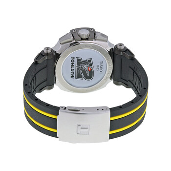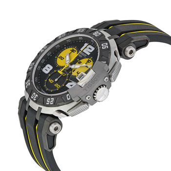 Stainless steel case with a black and yellow rubber strap. Fixed stainless steel bezel with a black top ring. Black dial with luminescent hands and index hour markers. Arabic numerals mark the 4, 8 and 12 o'clock positions. Minute markers. Tachymeter around the outer rim. Dial Type: Analog. Luminescent hands and markers. Date display at the 3 o'clock position. Chronograph - three sub-dials displaying: 60 second, 30 minute and 1/10th of a second. Quartz movement. Scratch resistant sapphire crystal. Screw down crown. Solid case back. Case diameter: 45.25 mm. Round case shape. Folding clasp with push button release. Water resistant at 100 meters / 330 feet. Functions: chronograph, date, hour, minute, second. Sport watch style. Watch label: Swiss Made. Tissot T-Race Thomas Luthi 2015 Black Dial Black and Yellow Rubber Band Men's Sports Watch T0924172705700.