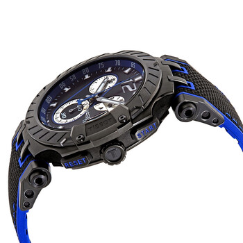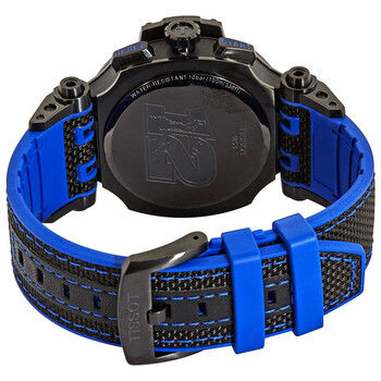 Black and grey PVD stainless steel case with a black and blue rubber strap. Fixed black PVD bezel. Black and blue dial with luminous silver-tone hands and index hour markers. An Arabic numeral appears at the 12 o'clock position. Minute markers. Tachymeter markings around the outer rim. Dial Type: Analog. Luminescent hands and markers. Date display at the 3 o'clock position. Chronograph - three sub-dials displaying: 60 second, 30 minute and 1/10th of a second. ETA caliber G10.212 quartz movement. Scratch resistant sapphire crystal. Solid case back. Round case shape. Case size: 47.6 mm. Case thickness: 12.7 mm. Band width: 22 mm. Tang clasp. Water resistant at 100 meters / 330 feet. Functions: chronograph, rattrapante, date, hour, minute, small second. Additional Info: limited edition 1993 pieces. Sport watch style. Watch label: Swiss Made. Tissot T-Race Thomas Luthi 2019 Limited Edition Men's Watch T115.417.37.057.03.