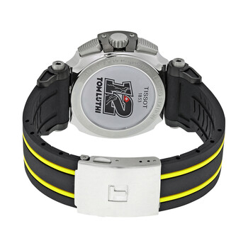 Stainless steel case with a black and yellow rubber strap. Black PVD (brake-disc) bezel. Anthracite dial with silver-tone hands and Arabic numeral hour markers. Minute markers. Tachymeter markings around the outer rim. Dial Type: Analog. Luminescent hands. Date display at the 3 o'clock position. Chronograph - three sub-dials displaying: 60 second, 30 minute and 1/10th of a second. ETA caliber G10.212 quartz movement. Scratch resistant sapphire crystal. Solid case back. Round case shape. Case dimensions: 47.2 mm x 45.25 mm. Case thickness: 12.8 mm. Fold over clasp. Water resistant at 100 meters / 330 feet. Functions: chronograph, rattrapante, date, hour, minute, small second. Additional Info: limited piece of 2112. Sport watch style. Watch label: Swiss Made. Tissot T-Race Thomas Luthi LIMITED EDITION Chronograph Men's Watch T092.417.27.067.00.