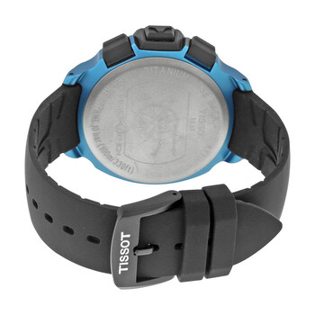 Blue aluminium case with a black silicone strap. Fixed black aluminium bezel. Black dial with luminous black hands and index hour markers. Arabic numerals mark the 3, 9 and 12 o'clock positions. Dial Type: Analog-digital. Luminescent hands and markers. Perpetual calendar. Digital sub-dial displaying: digital perpetual calendar / multi-function. ETA caliber E49.301 quartz movement. Scratch resistant tactile sapphire crystal. Screw down crown. Solid case back. Round case shape. Case size: 42.15 mm. Case thickness: 13.46 mm. Band width: 20 mm. Band length: 8 inches. Tang clasp. Water resistant at 100 meters / 330 feet. Functions: perpetual calendar, chronograph, world time, alarm, month, date, day, GMT, second time zone, hour, minute, second, compass, tide indicator. Additional Info: touch screen, stop watch, split time. in general, suitable for swimming and snorkeling, but not diving. Sport watch style. Watch label: Swiss Made. Tissot T-Race Touch Aluminium Black Dial Men's Watch T0814209705704.
