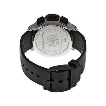 Stainless steel case with a black synthetic rubber strap. Fixed bezel. Black dial with luminous hands and index hour markers. Arabic numerals mark the 3, 9 and 12 o'clock positions. Dial Type: Analog-digital. Luminescent hands and markers. Digital multi-function sub-dial. Quartz movement. Scratch resistant sapphire touch crystal. Solid case back. Case diameter: 42 mm. Case thickness: 13.45 mm. Oval case shape. Band width: 20 mm. Tang clasp. Water resistant at 100 meters / 330 feet. Functions: chronograph, hour, minute, second. Casual watch style. Tissot T-Race Touch Analog Digital Dial Black Synthetic Strap Men's Watch T0814201705700.