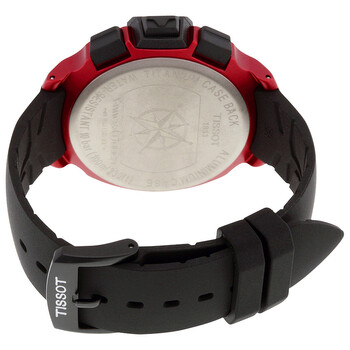 Red (antimagnetic) aluminium case with a black silicone strap. Fixed black aluminium bezel. Black carbon dial with black and white hands and index hour markers. Arabic numerals mark the 3, 9 and 12 o'clock positions. Dial Type: Analog-digital. Luminescent hands. Perpetual calendar. Digital display: perpetual calendar. ETA Caliber E49.301 quartz movement. Scratch resistant touch-sensitive sapphire crystal. Screw down crown. Solid case back. Round case shape. Case size: 42.15 mm. Case thickness: 13 mm. Band width: 20 mm. Band length: 8 inches. Tang clasp. Water resistant at 100 meters / 330 feet. Functions: perpetual calendar, chronograph, world time, alarm, month, date, day, GMT, second time zone, hour, minute, second, thermometer, altitude indicator, barometer, compass, tide indicator. Additional Info: touch screen, stop watch, split time. Sport watch style. Watch label: Swiss Made. Tissot T-Race Touch Red Aluminium Men's Sports Watch T0814209720700.