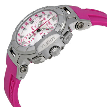 Stainless steel case with a pink rubber strap. Fixed stainless steel bezel. White dial with luminous silver-tone hands and index hour markers. Arabic numerals mark the 6, 9 and 12 o'clock positions. Minute markers. Tachymeter around the outer rim. Dial Type: Analog. Luminescent hands and markers. Date display at the 3 o'clock position. Chronograph - three sub-dials displaying: 30 minutes, 60 seconds and 1/10th of a second. Quartz movement. Scratch resistant sapphire crystal. Solid case back. Case diameter: 36 mm. Case thickness: 12 mm. Band width: 16 mm. Deployment clasp. Water resistant at 100 m / 330 ft. Functions: hours, minutes, seconds, chronograph, tachymeter, date. Sport watch style. Tissot T-RACE White Dial Pink Rubber Ladies Watch T0482171701701.