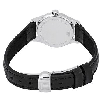 Stainless steel case with a black leather strap. Fixed stainless steel bezel. Black dial with silver-tone alpha-style hands and alternating Roman numeral and index hour markers. Dial Type: Analog. ETA caliber E61.031 quartz movement. Scratch resistant sapphire crystal. Pull / push crown. Solid case back. Round case shape. Case size: 25 mm. Case thickness: 5.2 mm. Band width: 12 mm. Butterfly clasp. Water resistant at 30 meters / 100 feet. Functions: hour, minute. Casual watch style. Watch label: Swiss Made. Tissot Tradition 5.5 Black Dial Ladies Watch T0630091605800.