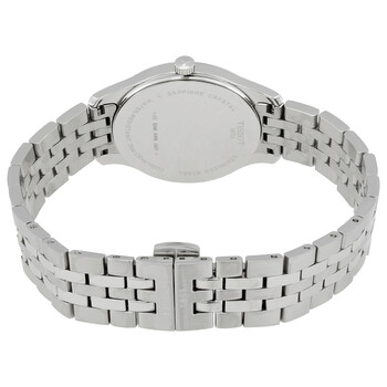 316L stainless steel case with a 316L stainless steel bracelet. Fixed 316L stainless steel bezel. Blue dial with silver-tone alpha-style hands and alternating Roman numeral and index hour markers. Dial Type: Analog. ETA caliber E61.031 quartz movement. Scratch resistant sapphire crystal. Pull / push crown. Solid case back. Round case shape. Case size: 31 mm. Case thickness: 5.15 mm. Band width: 14 mm. Butterfly clasp. Water resistant at 30 meters / 100 feet. Functions: hour, minute. Casual watch style. Watch label: Swiss Made. Tissot Tradition 5.5 Quartz Blue Dial Ladies Watch T063.209.11.048.00.