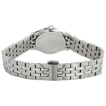 Stainless steel case with a stainless steel bracelet. Fixed stainless steel bezel. Black dial with silver-tone alpha-style hands and alternating Roman numeral and index hour markers. Dial Type: Analog. ETA caliber E61.031 quartz movement. Scratch resistant sapphire crystal. Pull / push crown. Solid case back. Round case shape. Case size: 25 mm. Case thickness: 5.2 mm. Band width: 12 mm. Fold over clasp with a push button release. Water resistant at 30 meters / 100 feet. Functions: hour, minute. Tradition Series. Casual watch style. Watch label: Swiss Made. Tissot Tradition Black Dial Stainless Steel Ladies Watch T063.009.11.058.00.