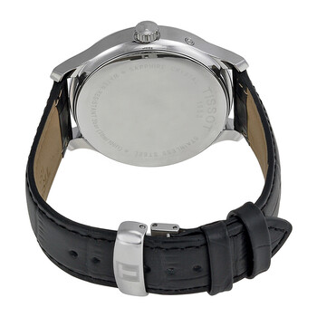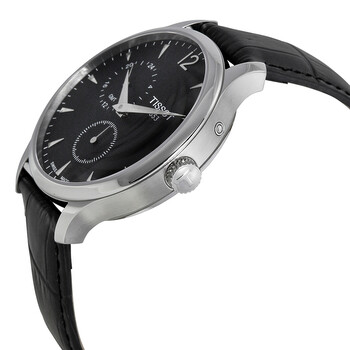 Stainless steel case with a black leather strap. Fixed stainless steel bezel. Black dial with silver-tone hands and index hour markers. An Arabic numeral marks the 12 o'clock position. Minute markers around the outer rim. Dial Type: Analog. Date display at the 3 o'clock position. Two sub-dials displaying: 60 second and 24 hour. Quartz movement. Scratch resistant sapphire crystal. Pull / push crown. Solid case back. Case diameter: 42 mm. Case thickness: 11 mm. Round case shape. Band width: 20 mm. Deployment clasp. Water resistant at 30 meters / 100 feet. Functions: date, GMT, second time zone, hour, minute, second. Casual watch style. Watch label: Swiss Made. Tissot Tradition GMT Black Dial Stainless Steel Men's Watch T0636391605700.