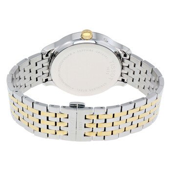 Stainless steel case with a two-tone (silver and gold PVD) stainless steel bracelet. Fixed stainless steel bezel. Silver dial with gold-tone hands and index hour markers. An Arabic numeral marks the 12 o'clock position. Minute markers around the outer rim. Dial Type: Analog. Date display at the 3 o'clock position. Seconds sub-dial at the 6 o'clock position. 24 hour (GMT) sub-dial. Quartz movement. Scratch resistant sapphire crystal. Solid case back. Case diameter: 42 mm. Case thickness: 11.7 mm. Round case shape. Butterfly clasp with a push button release. Water resistant at 30 meters / 100 feet. Casual watch style. Tissot Tradition Silver Dial Two-tone Men's Watch T0636392203700.