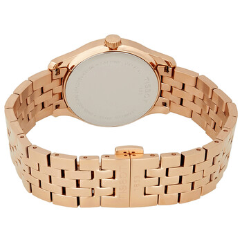 Rose gold PVD stainless steel case and bracelet. Fixed rose gold PVD bezel. White dial with rose gold-tone hands and index hour markers. Arabic numerals mark the 6 and 12 o'clock positions. Minute markers around the outer rim. Date display at the 3 o'clock position. Tissot calibre ETA F05.111 quartz movement. Scratch resistant sapphire crystal. Pull / push crown. Solid case back. Case size: 33 mm. Case thickness: 7.3 mm. Round case shape. Band width: 16 mm. Butterfly clasp. Water resistant at 30 meters / 100 feet. Functions: date, hour, minute, second. Casual watch style. Watch label: Swiss Made. Tissot Tradition T-Classic White Dial Ladies Watch T063.210.33.037.00.