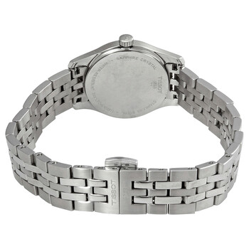 Stainless steel case with a stainless steel bracelet. Fixed stainless steel bezel. White dial with silver-tone alpha-style hands and alternating index and Roman numeral hour markers. Dial Type: Analog. ETA caliber E61.031 quartz movement. Scratch resistant sapphire crystal. Pull / push crown. Solid case back. Round case shape. Case size: 25 mm. Case thickness: 5.2 mm. Band width: 12 mm. Butterfly clasp. Water resistant at 30 meters / 100 feet. Functions: hour, minute. Casual watch style. Watch label: Swiss Made. Tissot Tradition Thin White Dial Ladies Watch T0630091101800.