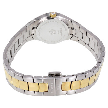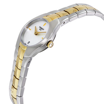 Stainless steel case with a two-tone (silver and gold PVD) stainless steel bracelet. Fixed stainless steel bezel. White mother of pearl dial with gold-tone hands. Index markers at the 3, 9 and 12 o'clock positions. Dial Type: Analog. Date display at the 6 o'clock position. Quartz movement. Scratch resistant sapphire crystal. Pull / push crown. Solid case back. Case diameter: 25.9 mm. Round case shape. Deployment clasp with push button release. Water resistant at 50 meters / 165 feet. Casual watch style. Tissot T-Round Mother of Pearl Dial Two-tone Ladies Watch T0960092211100.
