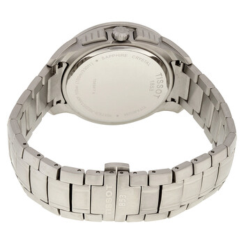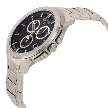 Titanium case with a titanium bracelet. Fixed titanium bezel. Black dial with luminous skeleton hands and index hour markers. Minute markers around the outer rim. Dial Type: Analog. Luminescent hands and markers. Date display at the 4 o'clock position. Chronograph - three sub-dials displaying: 60 second, 30 minute and 1/10th of a second. ETA caliber G10.211 quartz movement. Scratch resistant sapphire crystal. Pull / push crown. Solid case back. Case size: 43 mm. Case thickness: 11 mm. Round case shape. Band width: 19 mm. Band length: 8 inches. Deployment clasp with a push button release. Water resistant at 100 meters / 330 feet. Functions: chronograph, date, hour, minute, second. Additional Info: suitable for snorkeling, as well as swimming, but not diving. Casual watch style. Watch label: Swiss Made. Item Variations: T069 417 44 051 00, T069-417-44-051-00, T069/417/44/051/00, T0694174405100. Tissot Chronograph Black Dial Titanium Men's Watch T069.417.44.051.00.