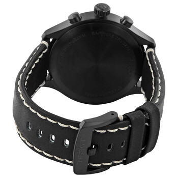 Black PVD stainless steel case with a black leather strap. Fixed black PVD bezel. Black dial with luminoius black hands and Arabic numeral hour markers. Arabic numeral minute markers (at 5 minute intervals). Dial Type: Analog. Luminescent hands and markers. Date display at the 6 o'clock position. Chronograph - three sub-dials displaying: 60 second, 30 minute and 1/10th of a second. ETA Caliber G10.212 quartz movement. Scratch resistant sapphire crystal. Solid case back. Round case shape. Case size: 45 mm. Case thickness: 11 mm. Band width: 22 mm. Tang clasp. Water resistant at 100 meters / 330 feet. Functions: chronograph, rattrapante, date, hour, minute, small second. T-sport Series. Sport watch style. Watch label: Swiss Made. Tissot T-Sport Chronograph Quartz Black Dial Men's Watch T116.617.36.052.02.