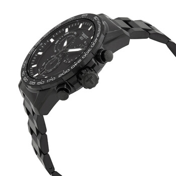 Black PVD 316L stainless steel case with a black PVD stainless steel bracelet. Fixed black PVD bezel with a black aluminium top ring. Black dial with luminous black hands and index hour markers. Minute markers around the outer rim. Tachymeter scale. Dial Type: Analog. Luminescent hands and markers. Date display at the 6 o'clock position. Chronograph - three sub-dials displaying: 60 second, 30 minute and 1/10th of a second. ETA Caliber G10.212 quartz movement. Scratch resistant sapphire crystal. Solid case back. Round case shape. Case size: 45.5 mm. Case thickness: 11.9 mm. Band width: 22 mm. Fold over clasp with a safety release. Water resistant at 100 meters / 330 feet. Functions: chronograph, rattrapante, date, hour, minute, small second. T-sport Series. Sport watch style. Watch label: Swiss Made. Tissot T-Sport Chronograph Quartz Black Dial Men's Watch T125.617.33.051.00.
